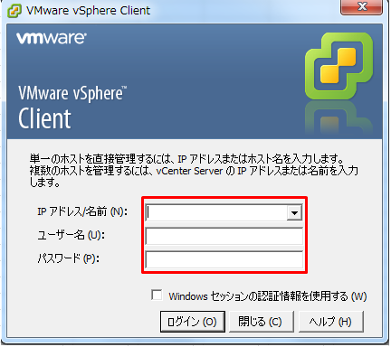 27.インストールしたVMware Sphere Clientを起動して作成したVmwareのIPとユーザー名とパスワードを入力してログイン